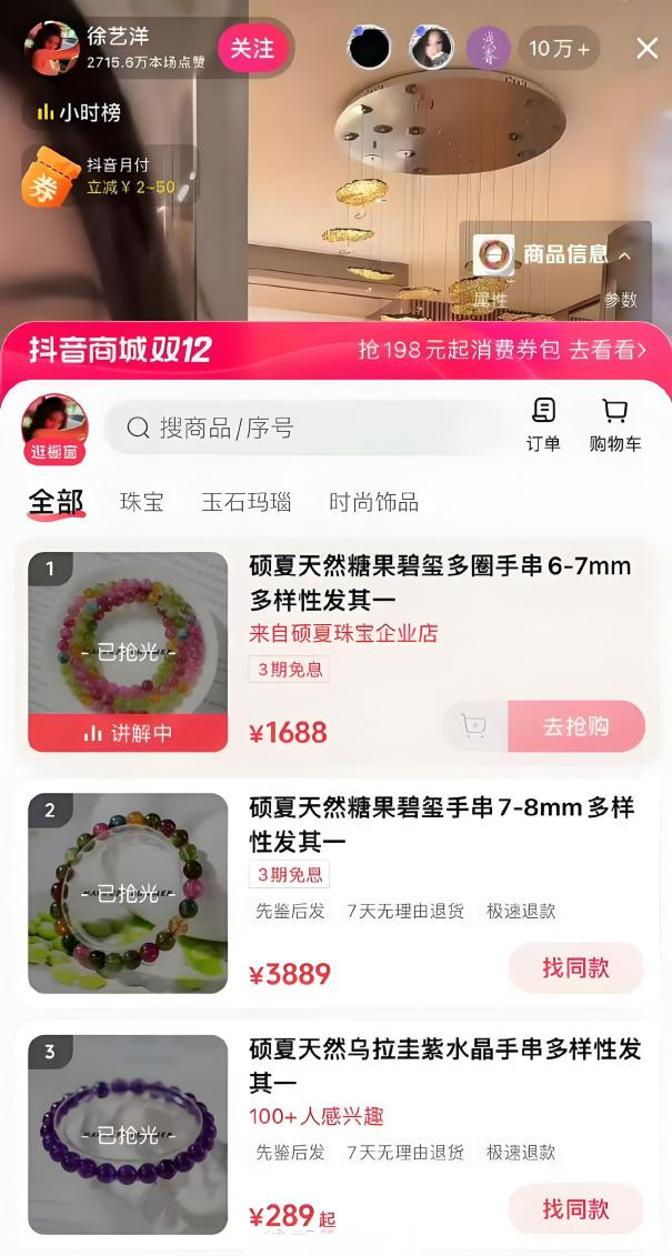 有媒体报道,据第三方数据平台显示,二人合体主播带货当天的销售额在100万-250万之间,其中标价215-226元的粉水晶手串最为紧俏,累计卖出了1000-2500条。