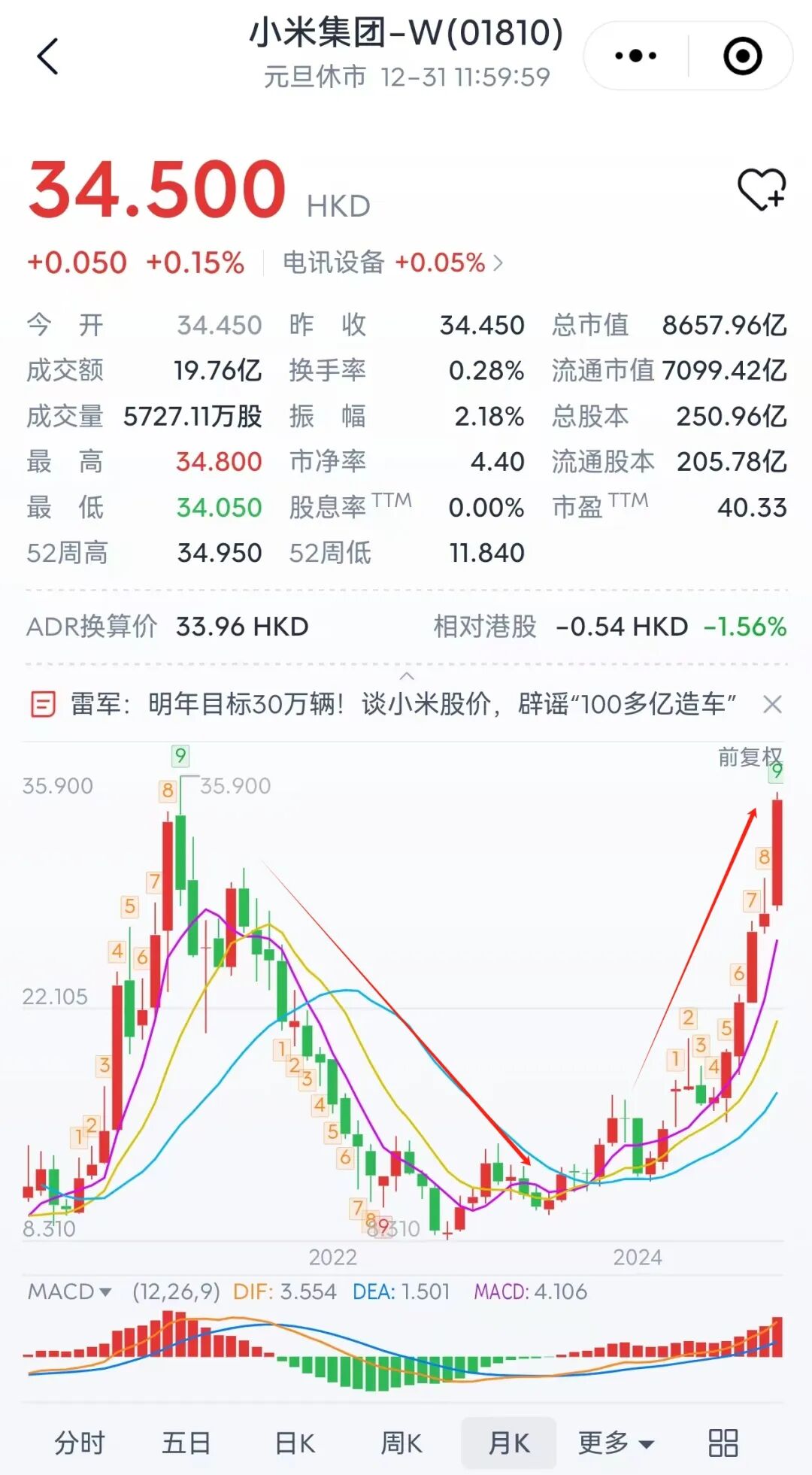 对此,雷军却用一句“年年难过年年过,一年过下来还不错”来带过。2023年以来,小米也凭借小米SU7、小米14、15等现象级爆款,堵住了质疑者的嘴巴,并迅速扭转颓势,带动业绩与股价迅速反弹,重新站上35元高位。