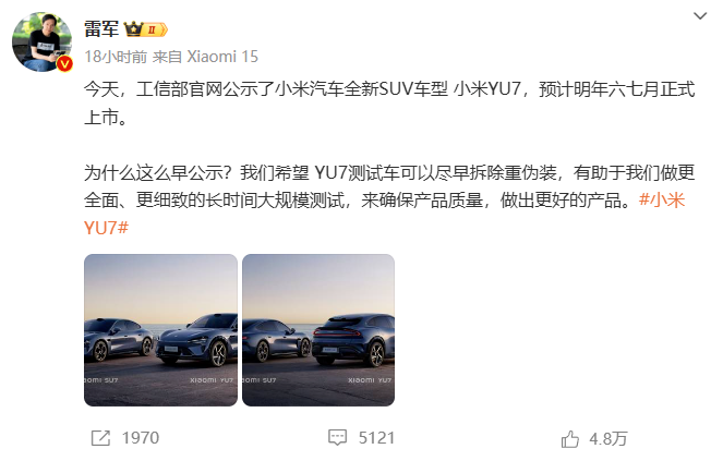 经过团队内部多番激烈讨论,权衡利弊之后,雷军最终毅然决定提前揭开 小米YU7的神秘面纱。