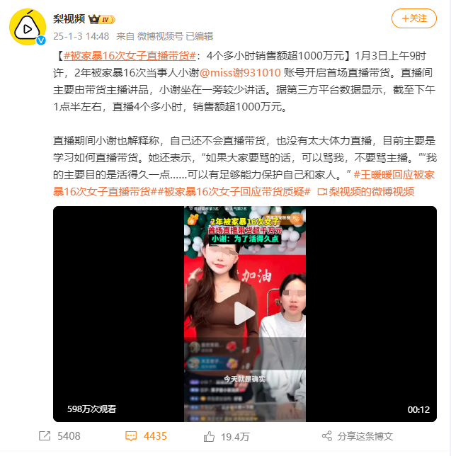 和很多走上直播带货之路的人不同,小谢只想“活得久一点”,只是普通的“活着”都成了愿望,一切还要从小谢的过去说起:比起“小谢”,她有一个更广为人知的代号:“被家暴16次女子”。
