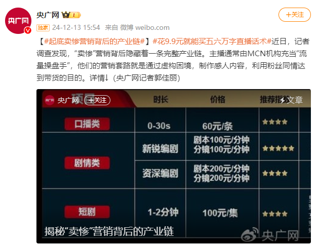 就在上个月,央广网还发文起底“卖惨营销”内幕,表示:“卖惨”营销背后隐藏着一条完整产业链。