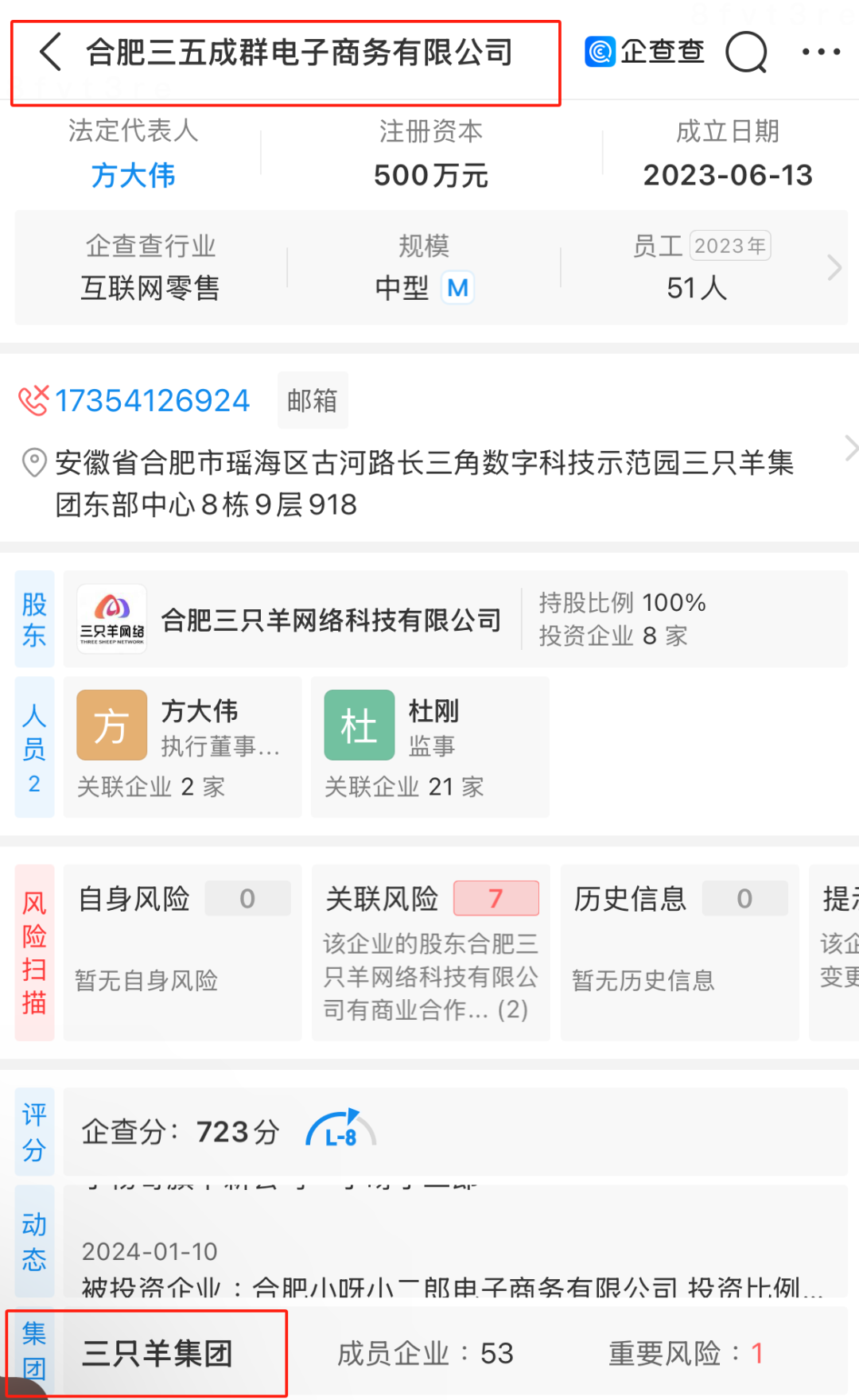 而且企查查显示,合肥三五成群属于合肥三只羊100%控股的子公司。