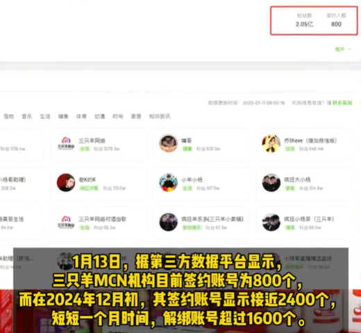 据蓝鲸新闻报道,1月13日,据第三方数据平台显示,三只羊MCN机构目前签约账号为800个。