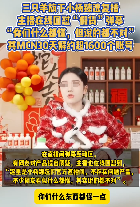 对此,三只羊主播回怼到:“这里是小杨臻选的官方直播间,不存在问题产品,你们什么东西都懂一点,但其实说的都不对。”