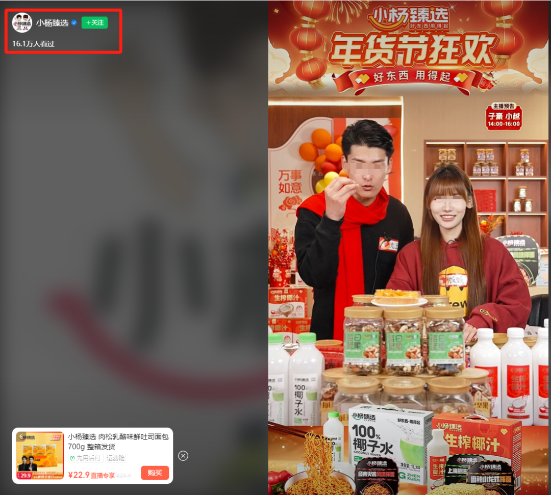 电商天下发现,这一主题为“年货节狂欢”的直播间带货的产品均为“小杨臻选”的自营产品,包括椰子水、椰汁、拌面、坚果等,截至昨天下午五点,直播间的观看人数已经突破16万,且人气呈现持续上涨趋势。