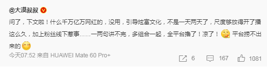 b站@大漠叔叔在今日(8月7日)发文表示:“问了,下文啦!什么千万亿万网红的,没用,引导炫富文化,不是一天两天了,尺度够放得开了播这么久,加上粉丝线下惹事......一两句讲不完,多组合一起,全平台拖了!凉了!平台捞不出来的”。