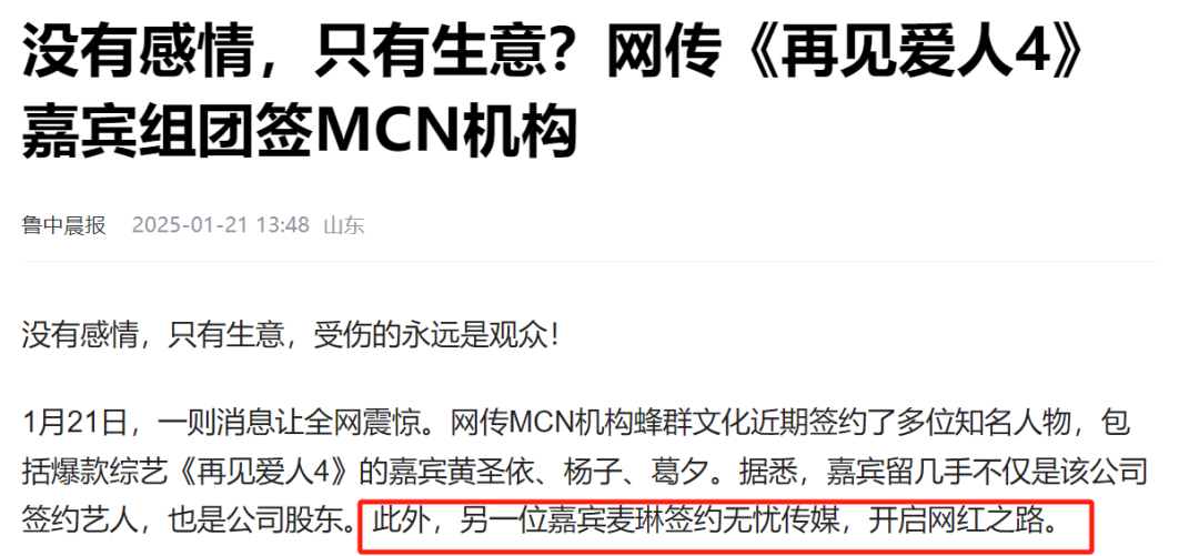 值得一提的是,除了上述四人,一度频频霸占热搜的嘉宾麦琳也被传已签约头部MCN机构无忧传媒,显然也有趁热打铁将流量变现的打算。