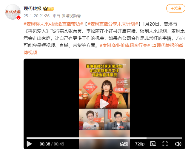 在1月20日晚上,《再见爱人4》这档综艺节目中备受争议的嘉宾麦琳,现身小红书平台《又见爱人》的直播间,与知名人士张泉灵、李松蔚进行了连麦直播。