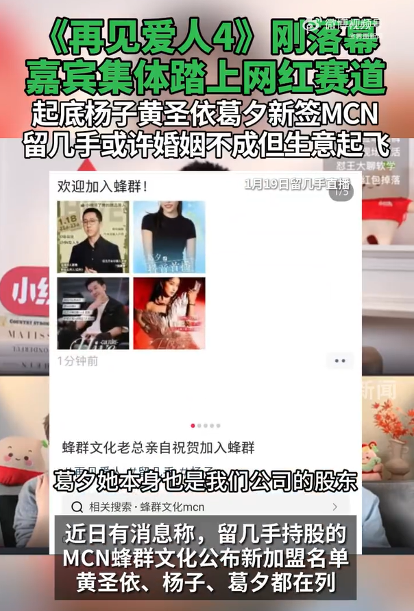 近日,有消息称,在知名MCN公司蜂群文化公布的最新加盟名单中,出现了《再见爱人4》的嘉宾杨子、黄圣依、葛夕的名字。