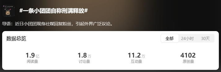 但一瞬之间,#一条小团团自称刑满释放#的话题,便同步登上了微博与抖音的热搜榜,引发无数人吃瓜。