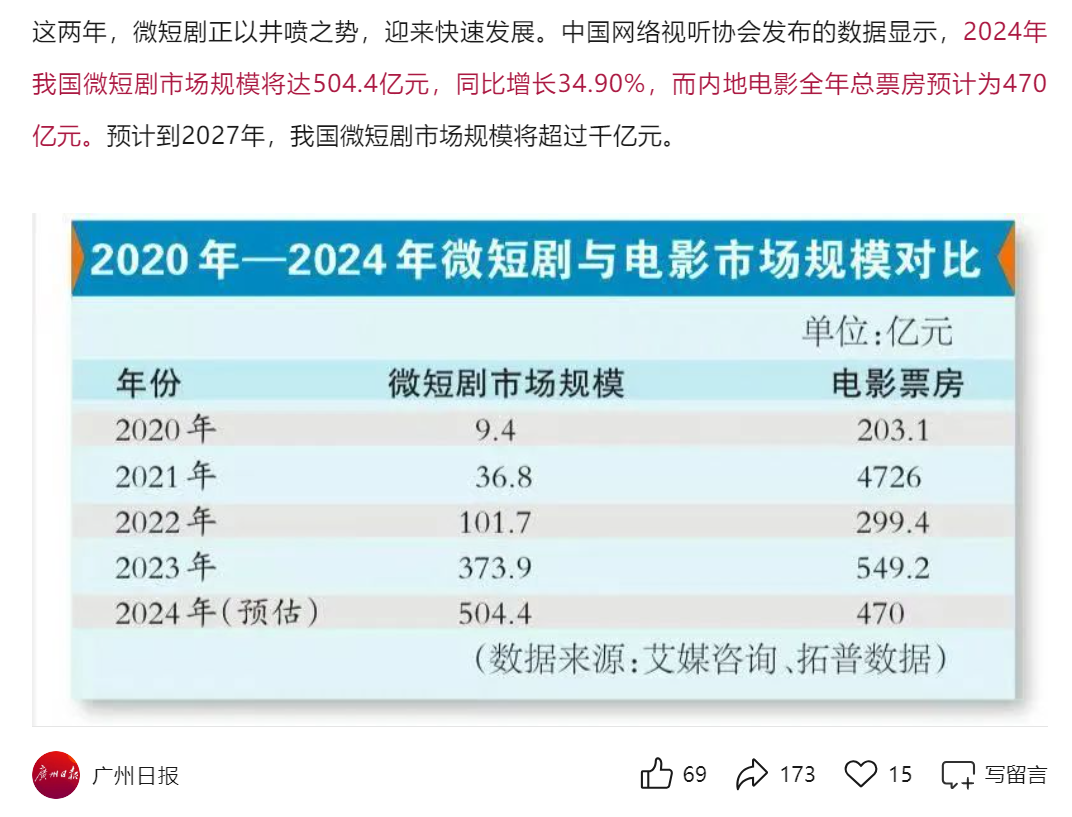 中国网络视听协会发布的数据显示,2024年我国微短剧市场规模将达504.4亿元,同比增长34.90%,首次超越电影票房,而微短剧贡献了其中80%的增量。