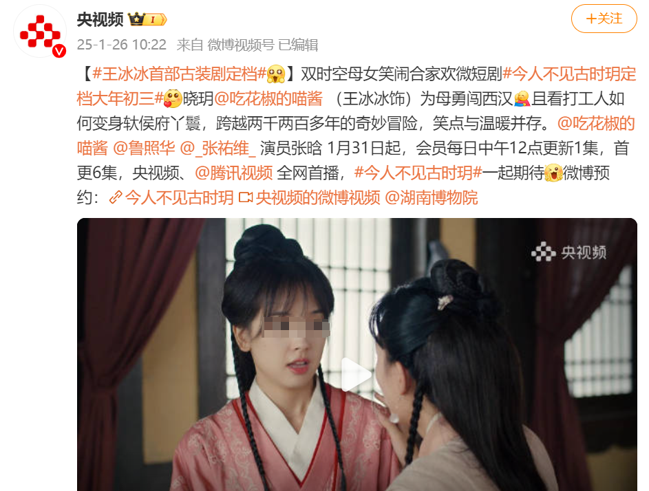 据了解,《今人不见古时玥》是由中央广播电视总台央视频和海发文化联合出品、由导演彭晨执导的精品微短剧,也是“王冰冰三部曲”中的第一部。