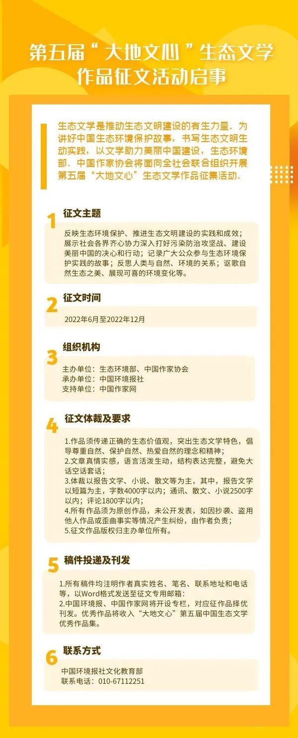 据了解,本届征文征集时间为2022年6月至12月,征文主题为反映生态环境保护、推进生态文明建设的实践和成效;展示社会各界齐心协力深入打好污染防治攻坚战、建设美丽中国的决心和行动;记录广大公众参与生态环境保护实践的故事;反思人类与自然、环境的关系;讴歌自然生态之美、展现可喜的环境变化等。