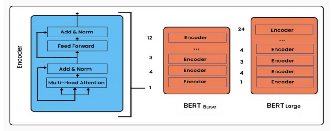BERT模型的核心架构包含的是这个编码器(Encoder),该编码器由多个 Transformer层堆叠而成。每个Transformer 层包含多头自注意力机制和前馈神经网络,并且还引入了位置编码,来表示单词在句子中的位置信息。另外,它还有2个变种,分别是Bert Base 和 Bert Large。BERT-BASE 在编码器堆栈中有 12 层,而 BERT-LARGE 在编码器堆栈中有 24 层,相比原始论文中建议的 Transformer 架构,BERT具有更大的前馈网络和更多的注意力头。