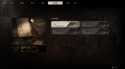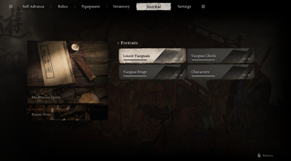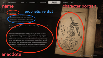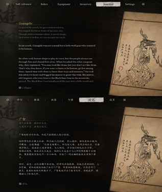 《黑神话:悟空》中,游戏的背包界面有一个特殊部分叫作“游记”(Journal),在“游记”里可以查看游戏的图鉴系统——“影神图”(Portraits):“有好事者,将天命人(the Destined One)沿途所遇的精怪人物,画影图形,抄名访姓,连同生平轶事,一起誊录在了一本游记之中。”