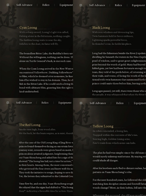 然而,并不是所有的角色名称都采用全部异化的方法进行直译,例如游戏中“四渎神龙”的翻译:赤髯龙—The Red Loong,小骊龙—Black Loong,青背龙—Cyan Loong,小黄龙—Yellow Loong。这里,译者为彰显四条神龙之间的联系,直接系统使用了简单的颜色词来概括每条龙的特点。对于普通中国玩家来说,这非常简洁直观,能看懂英文翻译的中文玩家甚至能更直接地了解神龙的特点,比如“骊”是黑色的代称。不过,仅以颜色译之稍显笼统,例如把“赤髯”译为 red,这跟其游戏内的形象和源语所表达的含义也存在很大区别。
