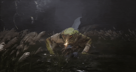 此外,游戏中还有一系列贯穿全游戏、形象类似青蛙的 Boss,其名称也使用了异化策略进行直译,分别是——“波里个浪”“浪里个波”“浪里个浪”“波里个波”“波浪浪”“浪波波”。这些角色全部使用了拟音直译,例如“波里个浪”译作 Baw-Li-Guhh-Lang,其他以此类推。