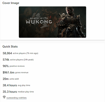 一款好的中国游戏,是外国玩家了解中国和中华优秀传统文化的窗口。9月20日,国外数据分析公司 VG Insights 的数据显示,国产3A游戏《黑神话:悟空》在 Steam 平台上的销量已经达到了2000万份,同时该游戏的总收入超过9.61亿美元(约合人民币逾67.9亿元)。