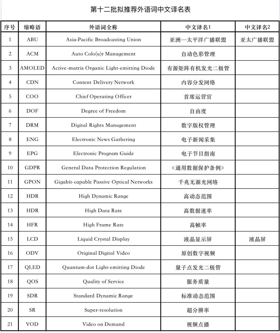 本次拟推荐使用的外语词中文译名,以广电行业为主要范围,选自《中国广播电影电视发展报告》(2018-2020)、《中国视听新媒体发展报告》(2018-2020)等。中文译名及用例均主要来自“人民网”“光明网”“新华网”、国家广播电视总局官网以及各地广播电视机构的专业部门网站。审议会专家认为,第十三批译名筛选工作细致、方法科学,在网络语料和数据库核查分析的基础上,充分征询专家和相关行业部门意见,兼顾了译名的科学性和通用性,有利于译名的推广应用。