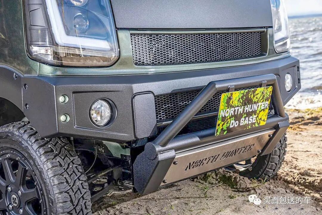 这个钢制前护架作为选装件,NORTH HUNTER铭牌位置是为选装电动绞盘而预留的。