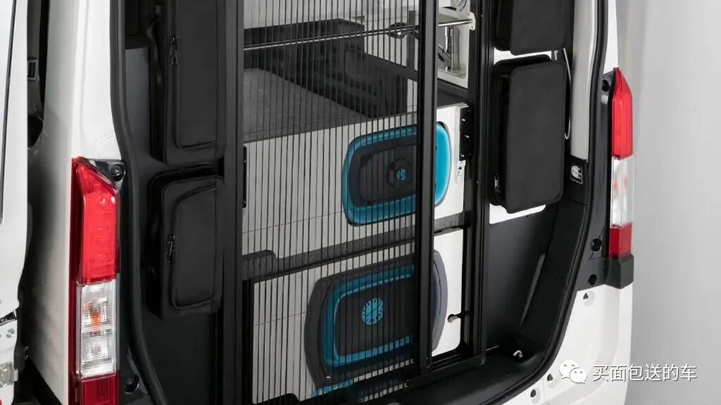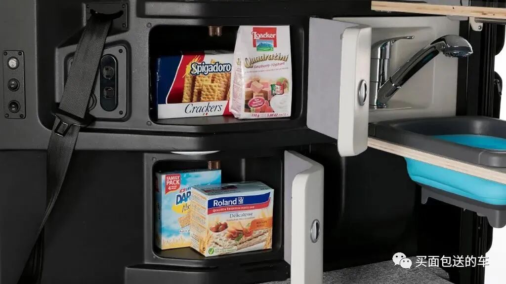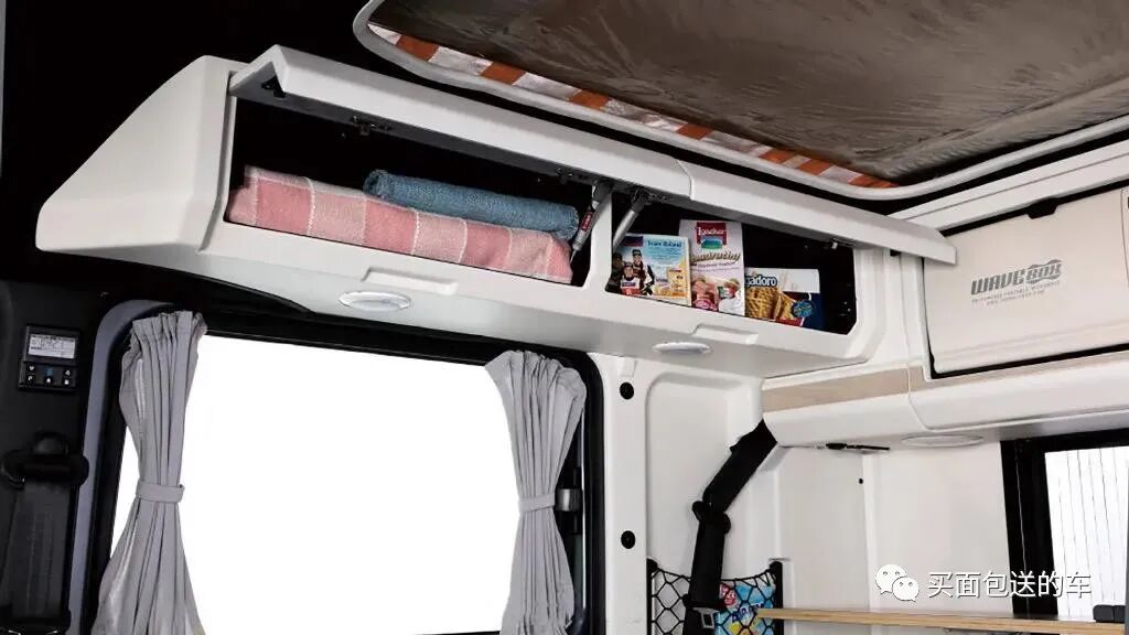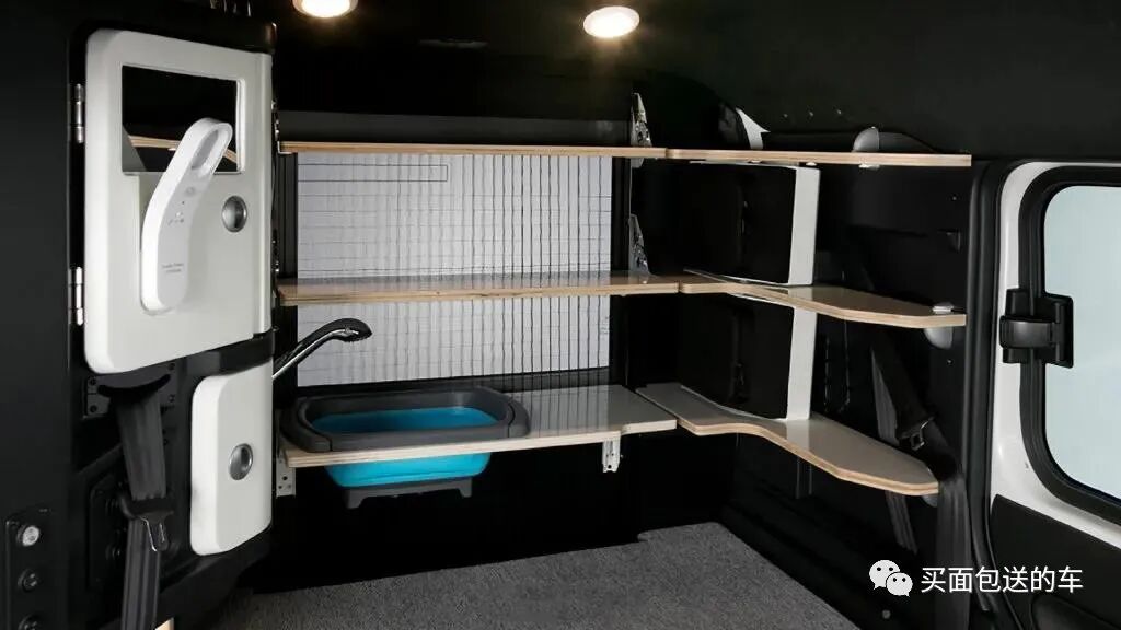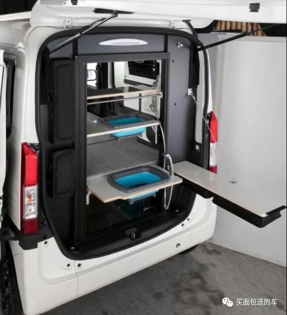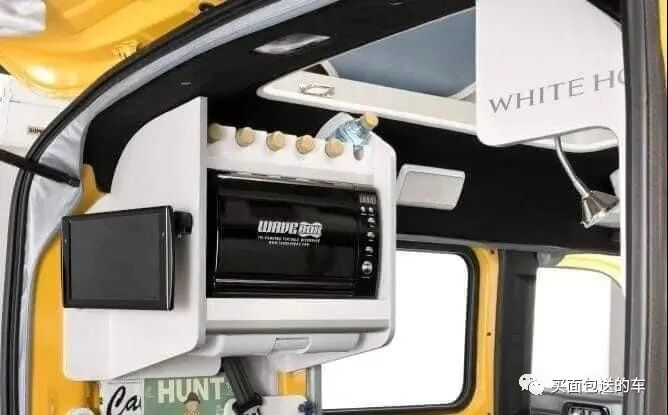 车顶侧置物柜和微波炉,后备箱空间集成厨卫设备。