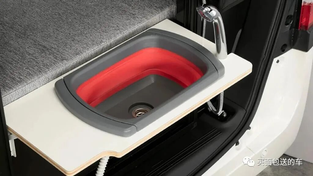 另外一种改装设计方案兼顾户外洗漱的需要,将折叠的水池和花洒头集成在折叠板上。