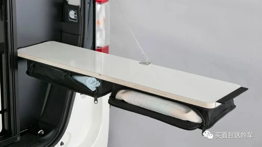 尾门D柱侧折叠安装的小座板,用软质的两个尼龙包收纳洗漱用品,干净毛巾和使用过的织物分开收纳。