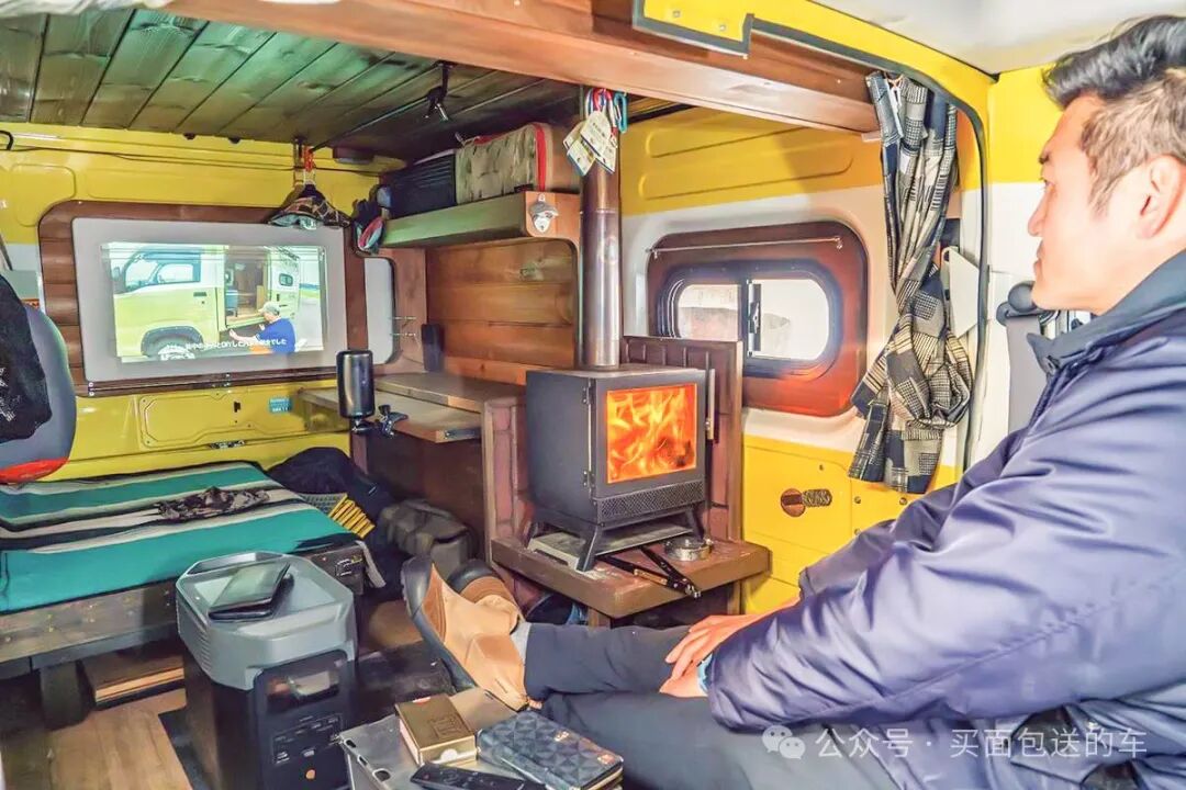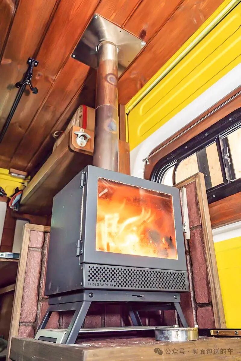 “凤凰崛起”工作室定制的真火壁炉,用硕大的高硼酸玻璃实现对外加热,废气通过车顶排出。