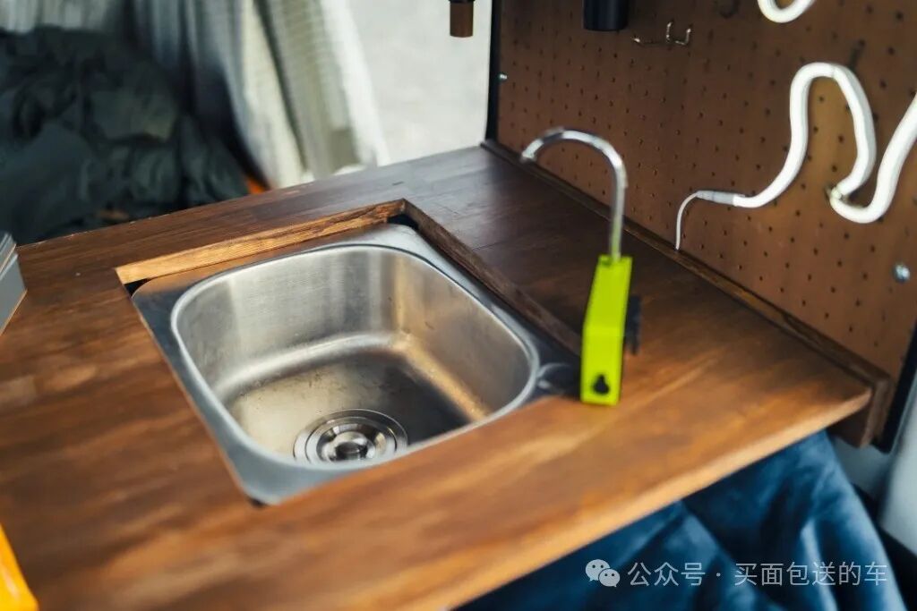 这个后备箱位置定制的水池和置物架板是自己设计的,并在本田的N VAN社区收到高人气的评价。