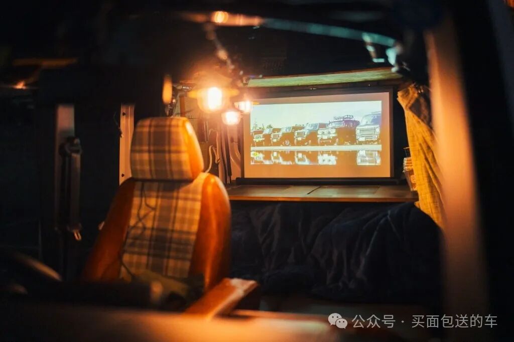 在车中泊的状态中,车窗外的光线被完全遮挡,尾门就作了投影的幕墙使用。