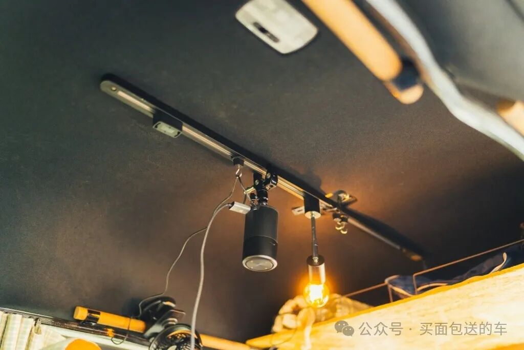 车顶上的射灯为摄影棚用的标准件,导轨是可滑动的电源插座。