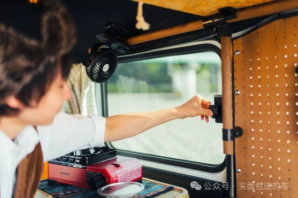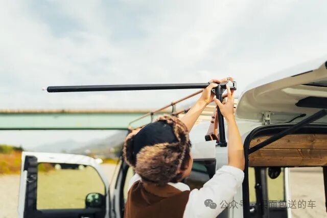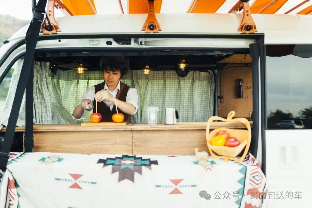 展开车侧面的帐篷和招牌就开始装备营业了。