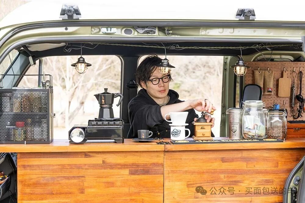 通过行李的展开和车边帐的搭建,就可以快速构建户外移动咖啡贩售点。