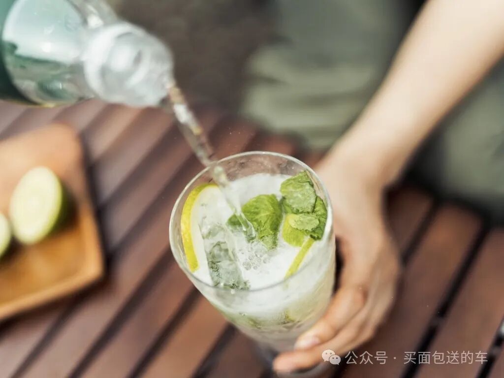 气泡水加烈酒,搭配薄荷叶与柠檬片就可以勾兑出实用的户外鸡尾酒。