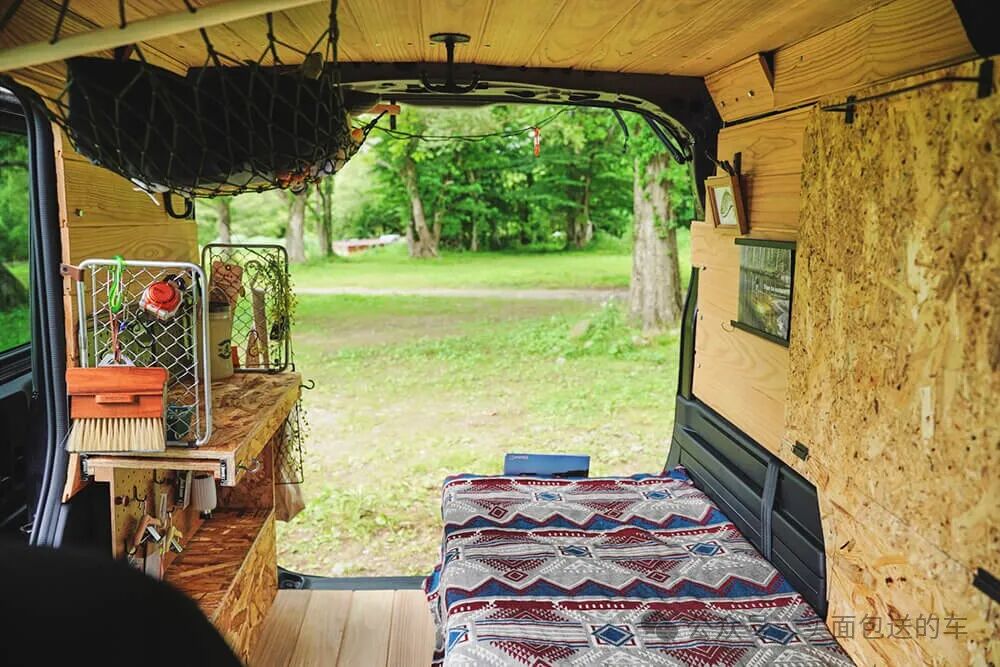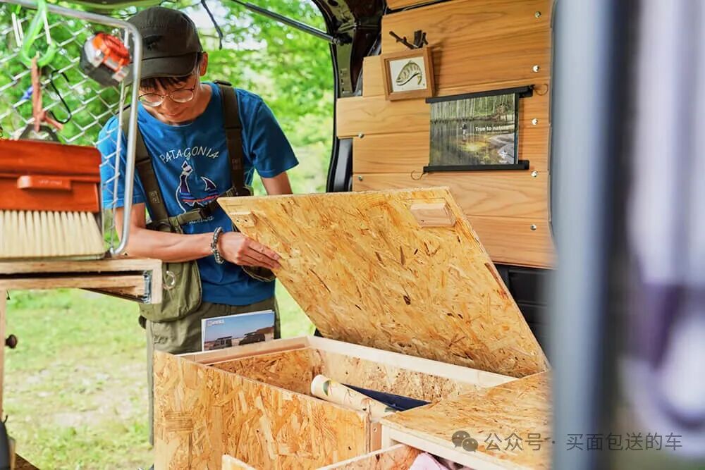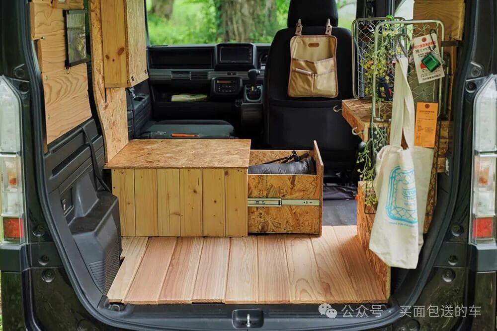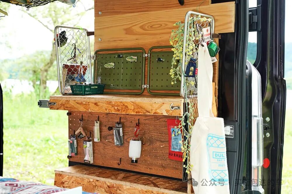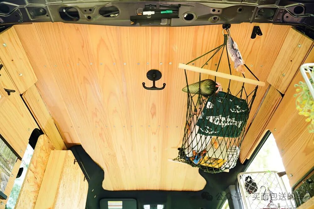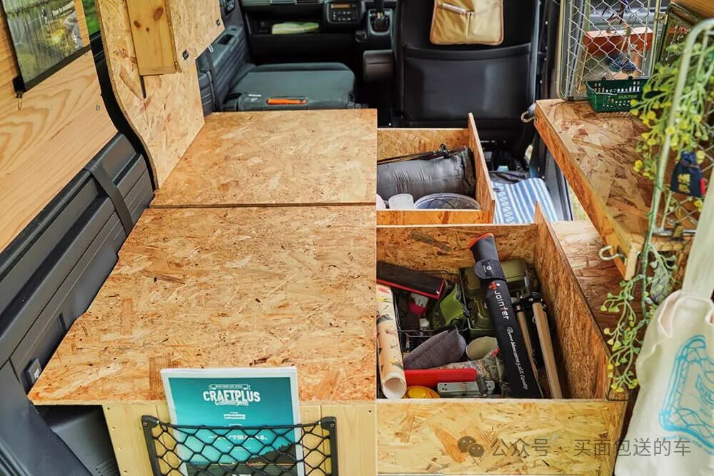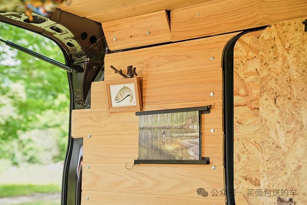 车内使用实木板进行装饰改造,让自己很像是美式VAN的风格,因为实木价格昂贵,也使用了部分刨花木板。
