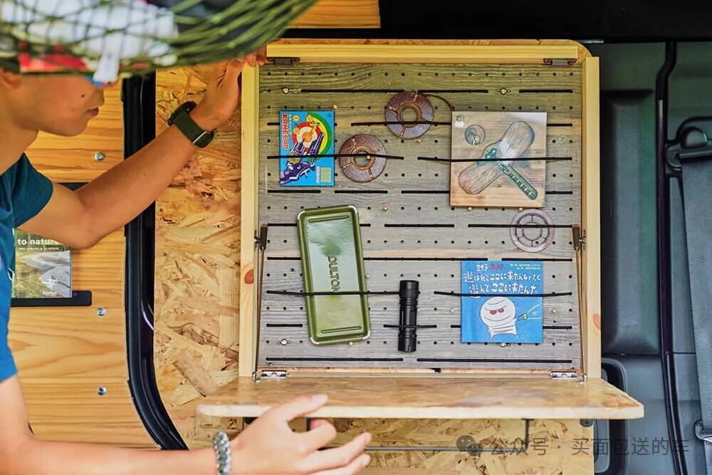 此外,为了在独自露营时利用更多空间,铃木先生的N-VAN还通过DIY安装了可折叠的工作台。