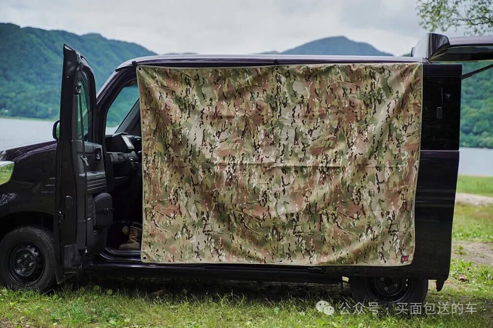 车边帐是一块防水的迷彩挂布,一边用卡子固定在车顶的挡水条上。