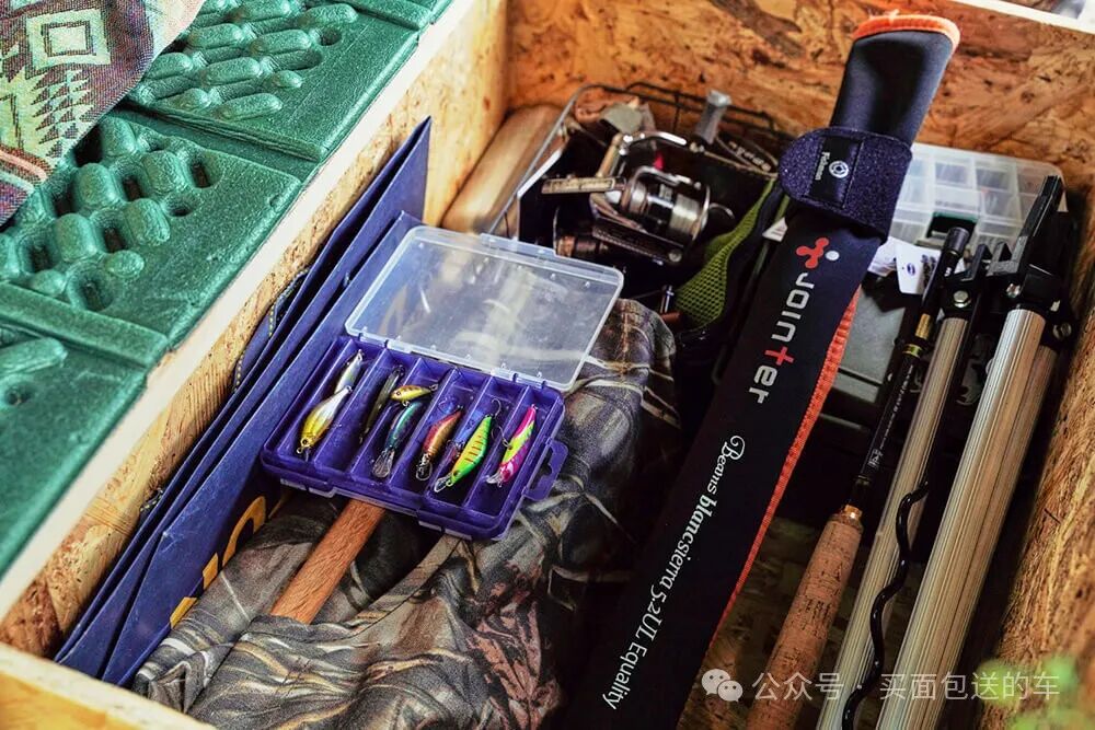 涉水裤(在水中钓鱼时使用的靴子)、水靴等被弄湿的物品都存放在这个木箱子中,实现了干湿分离。