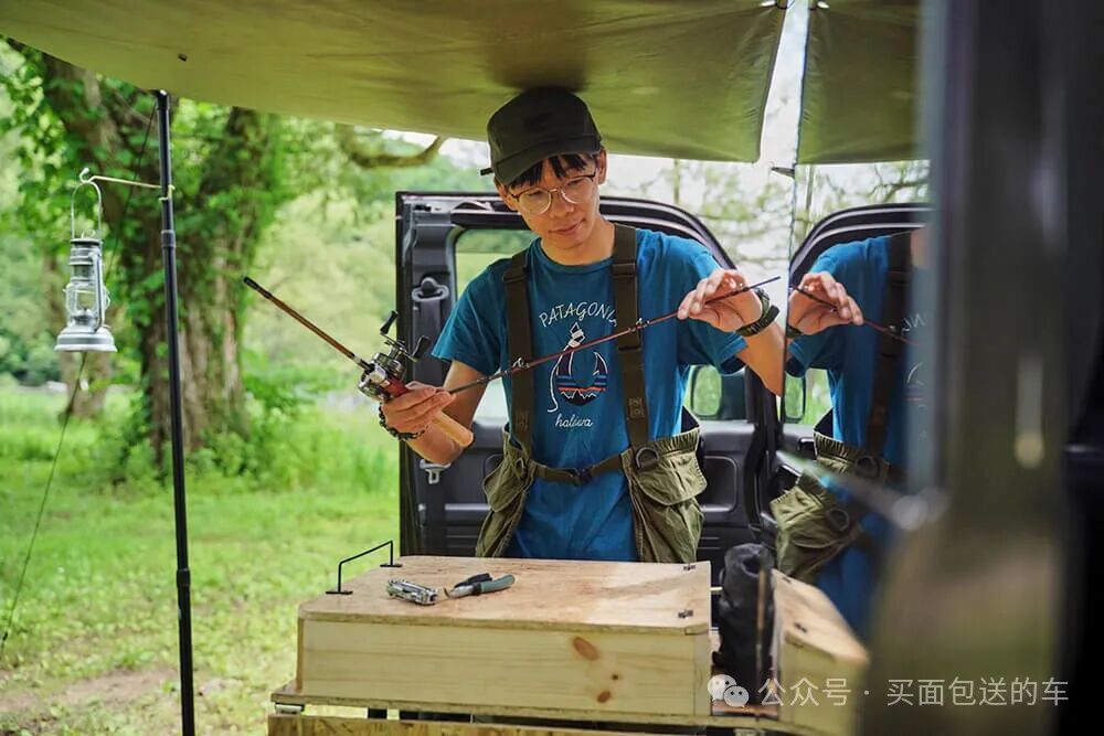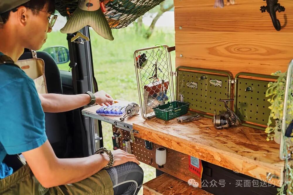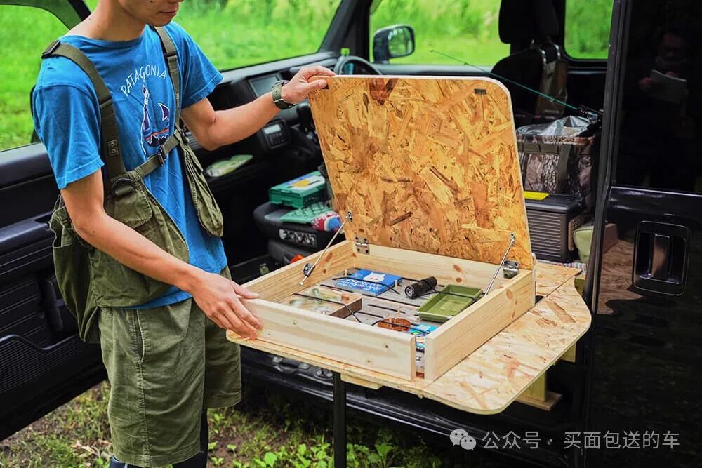 行李箱侧面有架子和桌子,作为准备钓鱼装备的工作台。