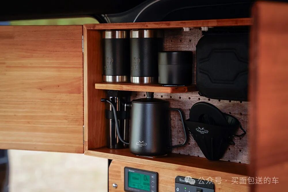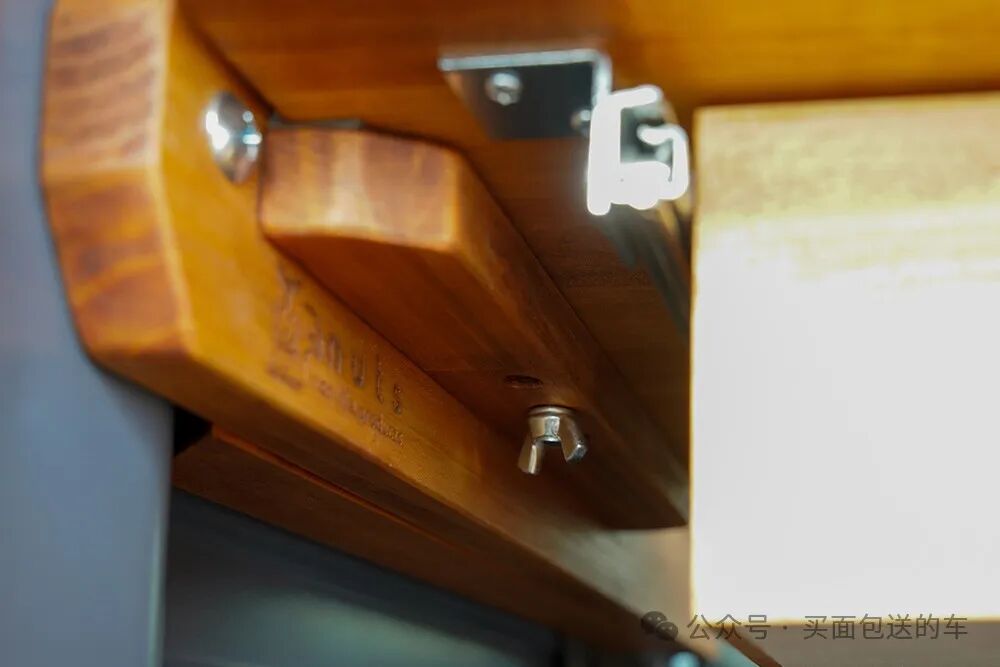 这个实木的收纳板架是“NUTS VANLIFE 坚果露营车”的产品之一,无损安装在N VAN的天花板上。