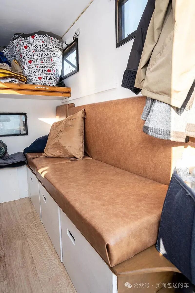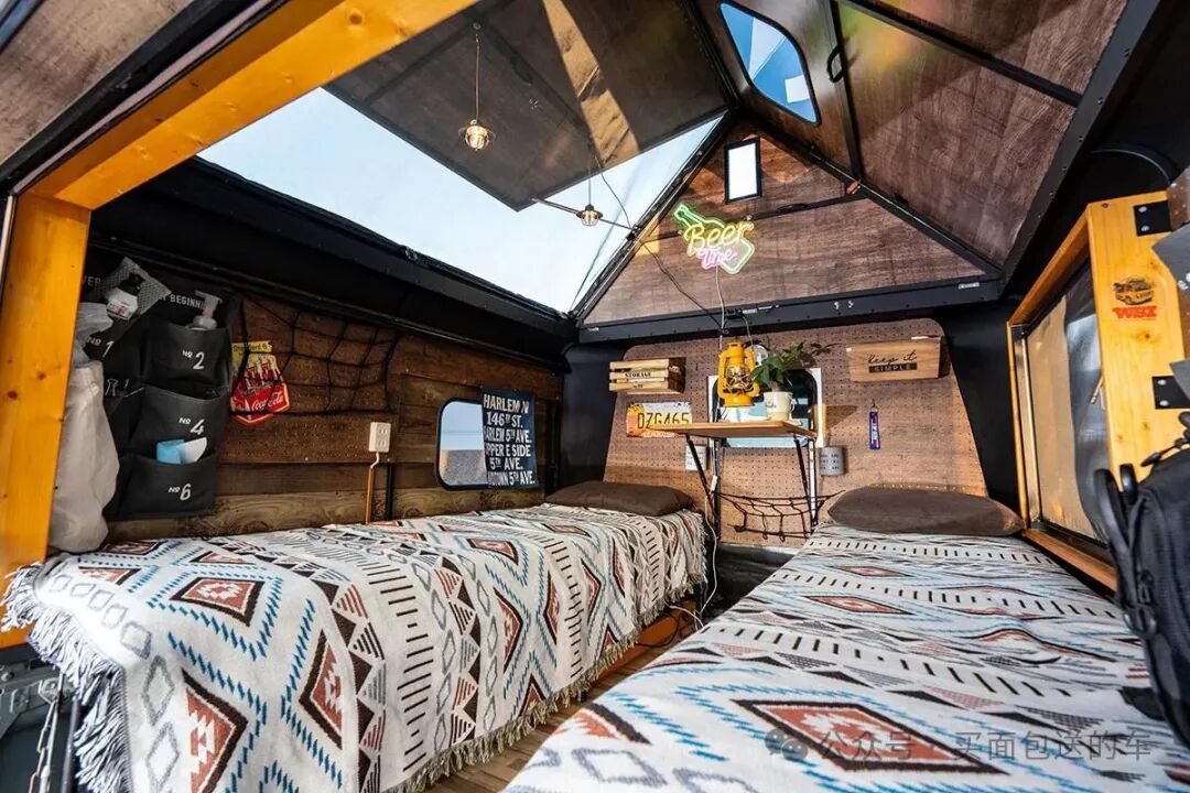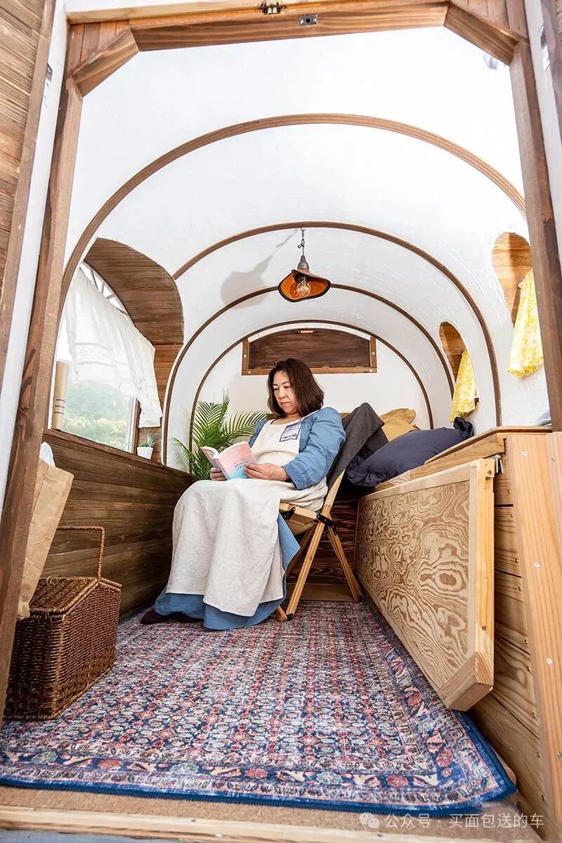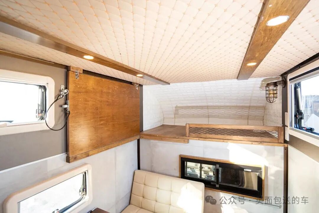 店主另外一辆作品采用了大量的二手回收木材,不过内饰装修更加充满复古的细节,白色的天花板让人联想传统大篷车的白色帐篷布。