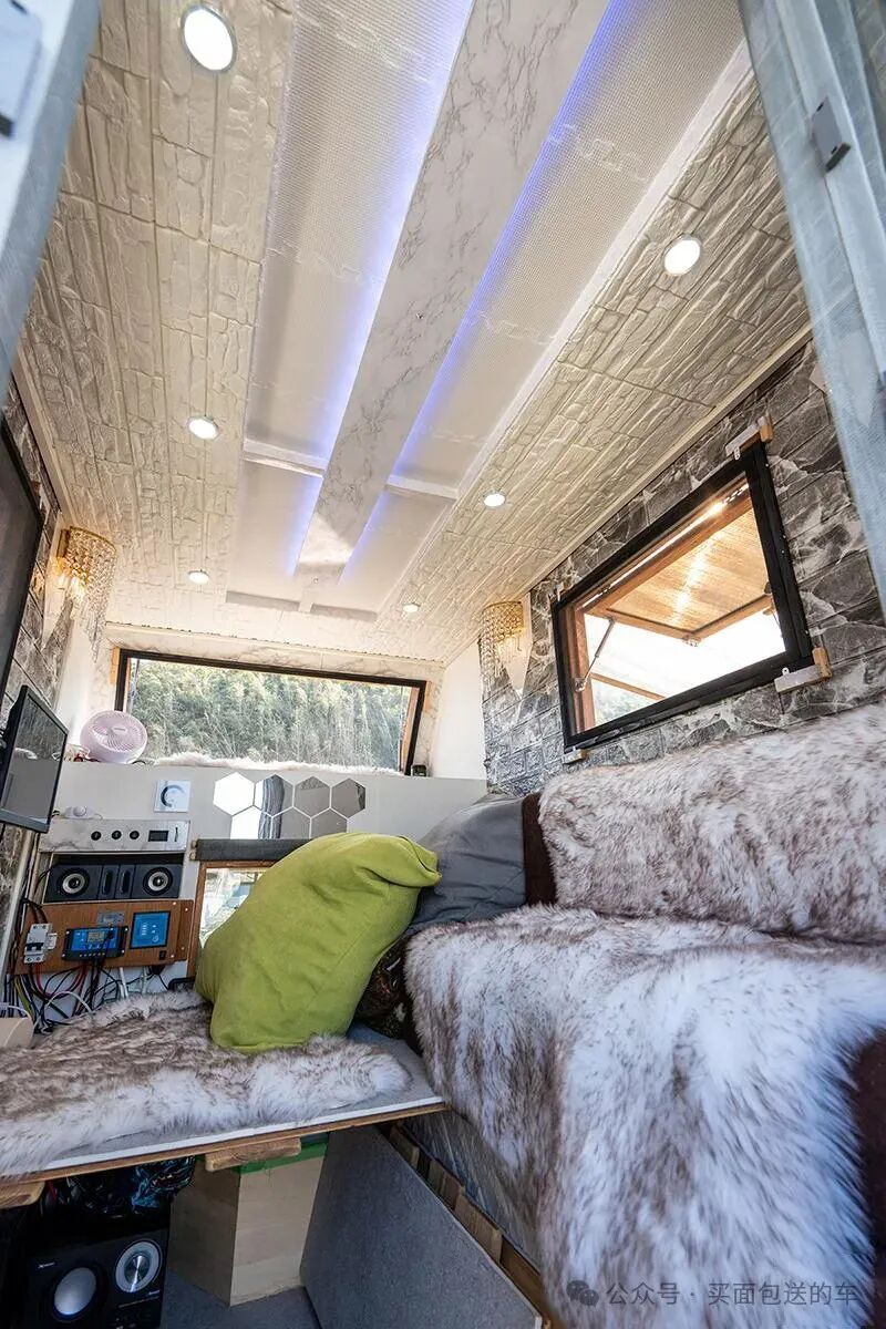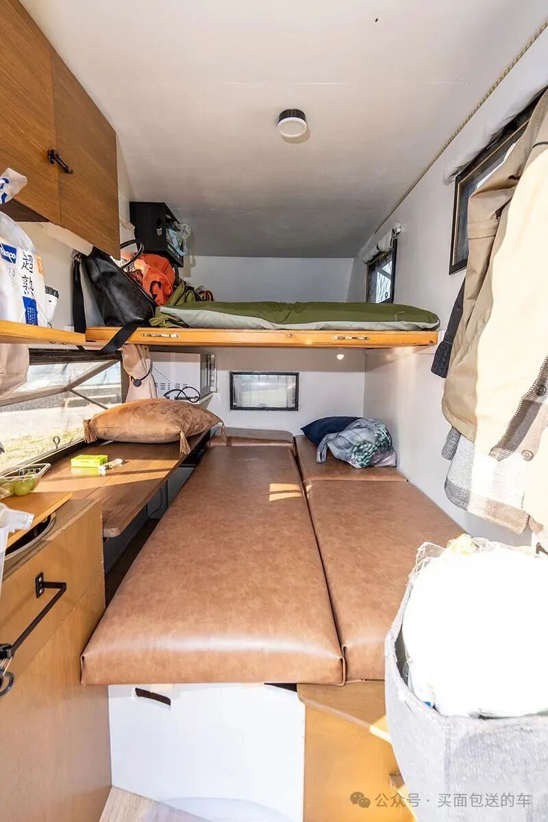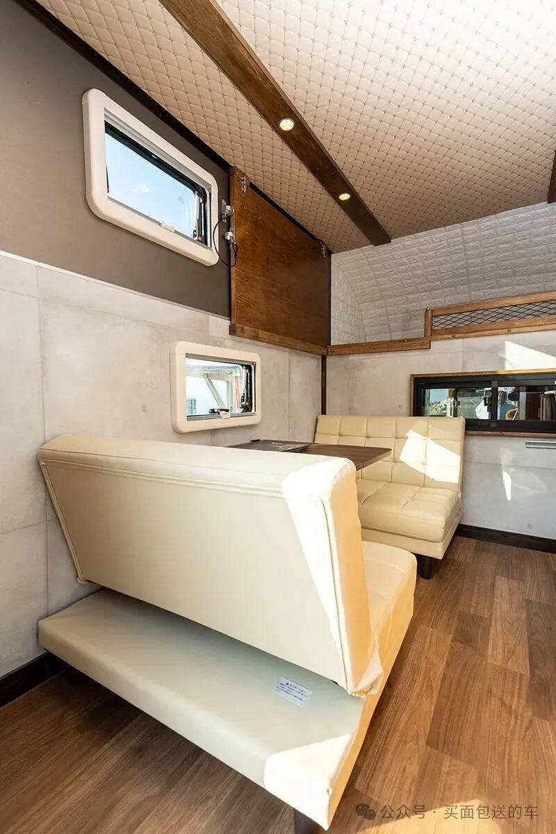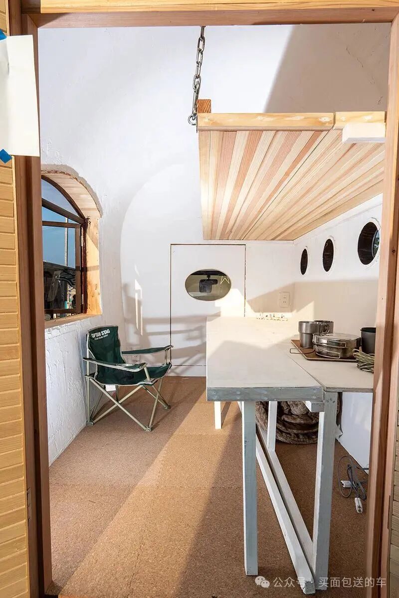 店主另外一辆作品采用了大量的二手回收木材,不过内饰装修更加充满复古的细节,白色的天花板让人联想传统大篷车的白色帐篷布。