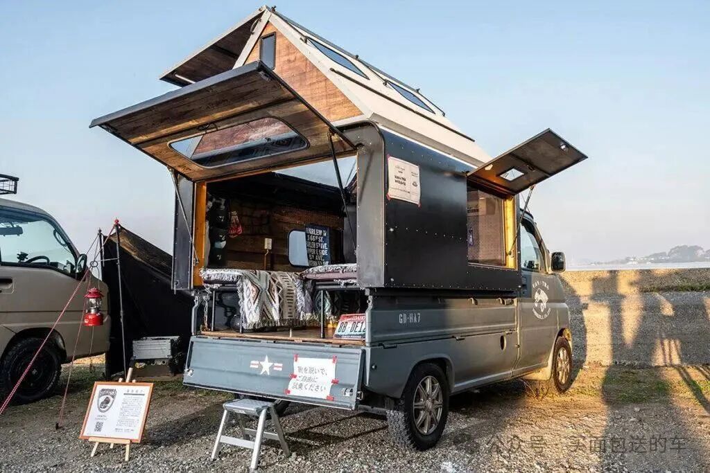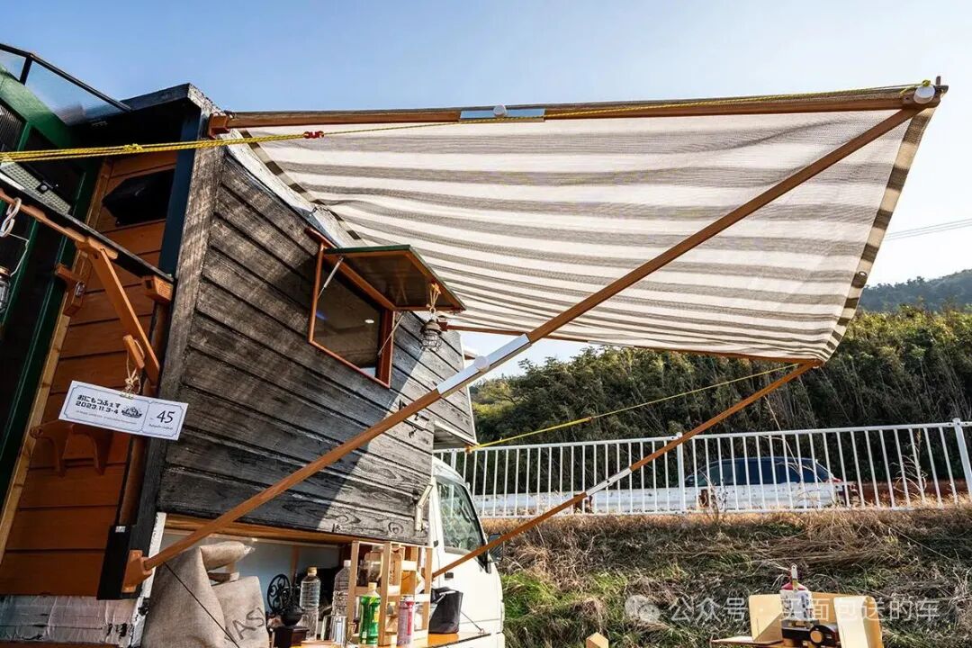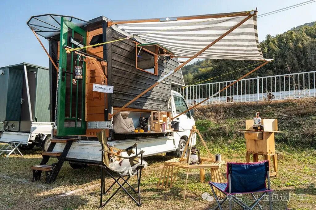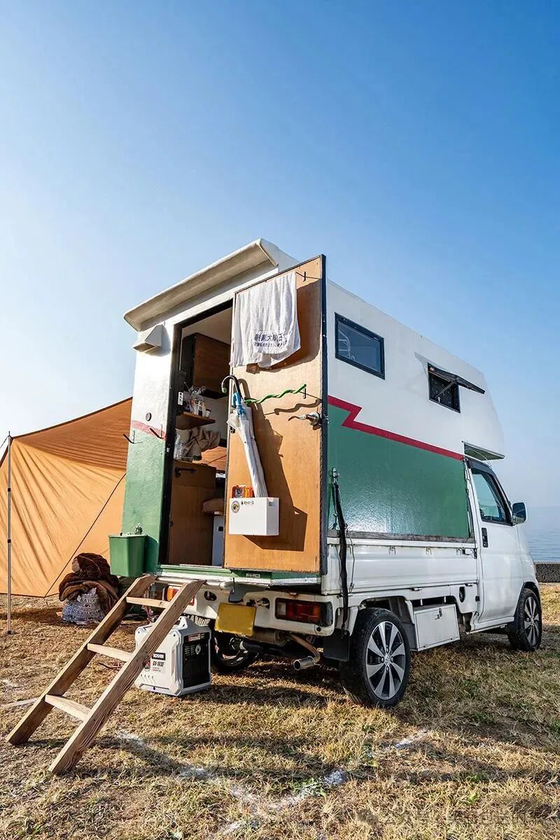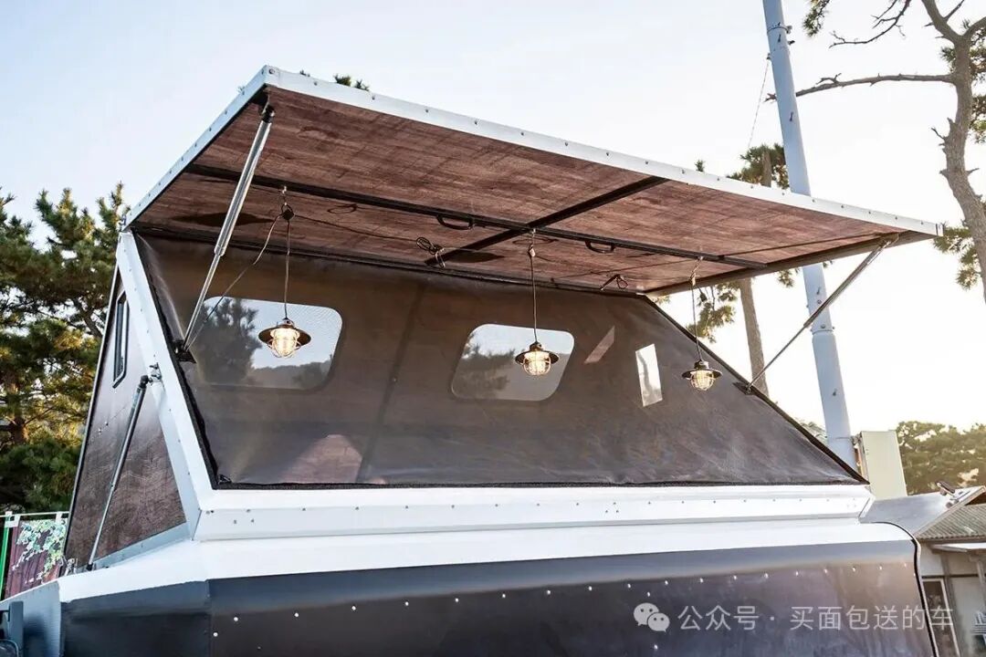 融合了岛国传统室内装饰风格的露营车,在打开车顶和侧门后,最大限度进行了借景。