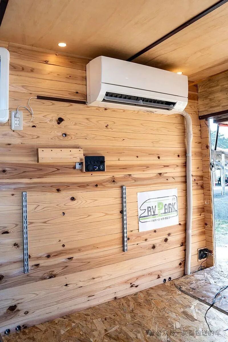 车内的内饰很简单,最大限度利用木板材料,并且高度达到1.8米,为玩家短期出租提供的灵活性,注意这个车内的空调。