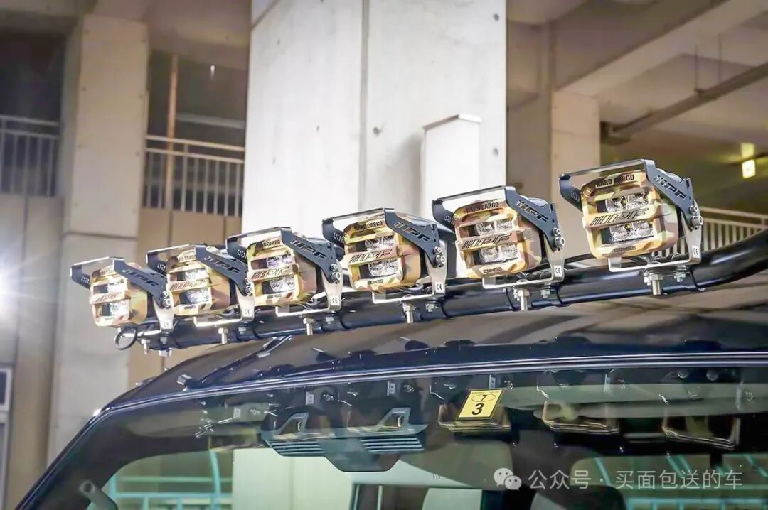 驾驶室的上部是IPF的642WL系列灯组,选装了金属防护架和迷彩橡胶套。