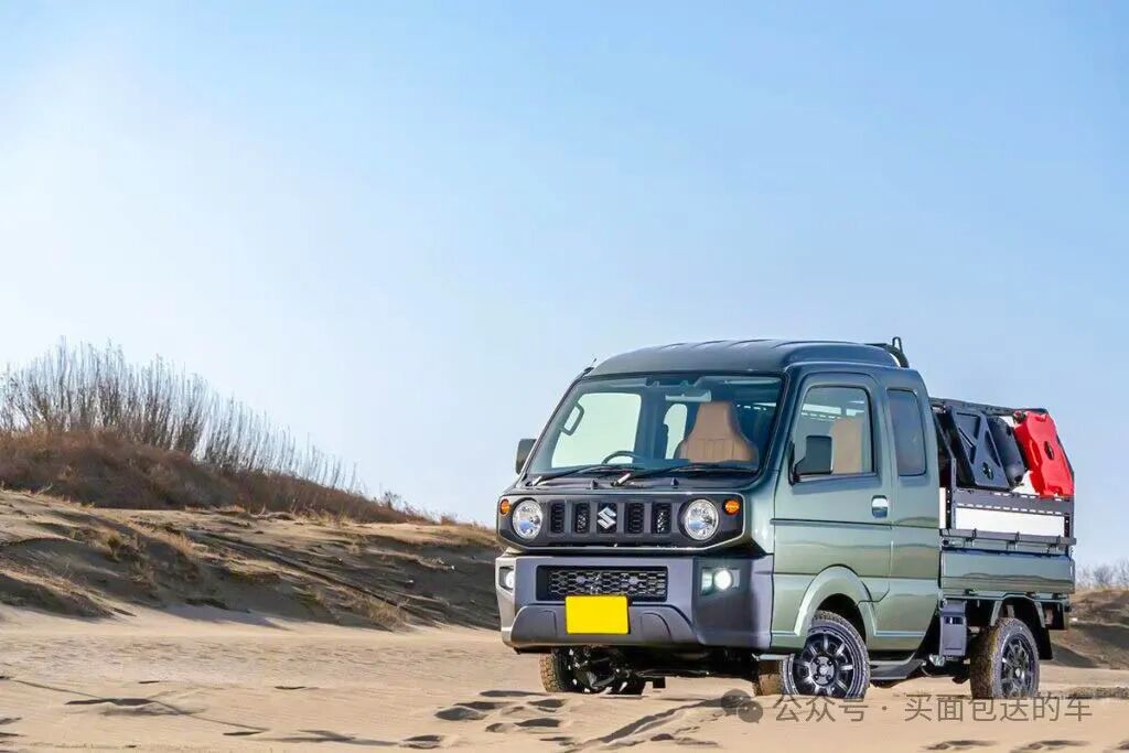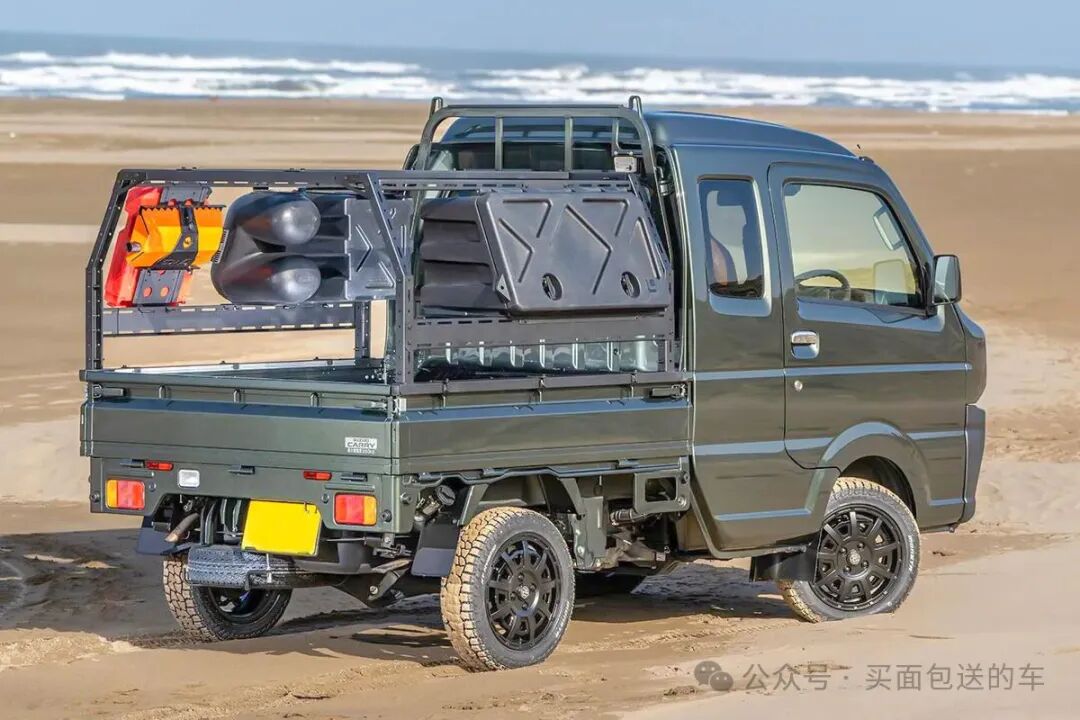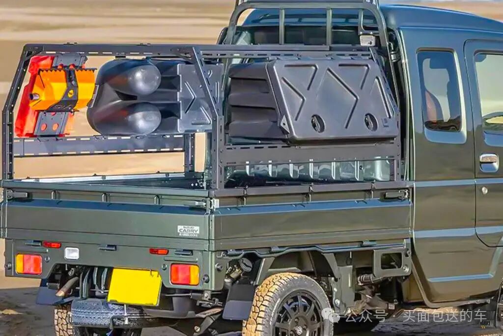 铃木super carry 轻卡,具有手动四驱款型,通过加装SPIELER“骆驼”荷台拓展架,脱离了单纯商用货运功能,变为户外活动的移动载具,案例中前脸改为JIMNY-AI套件。