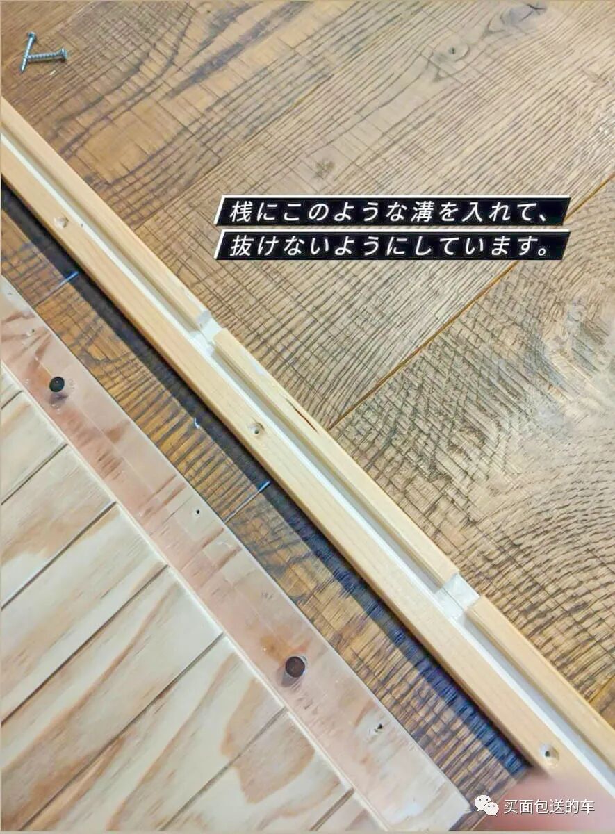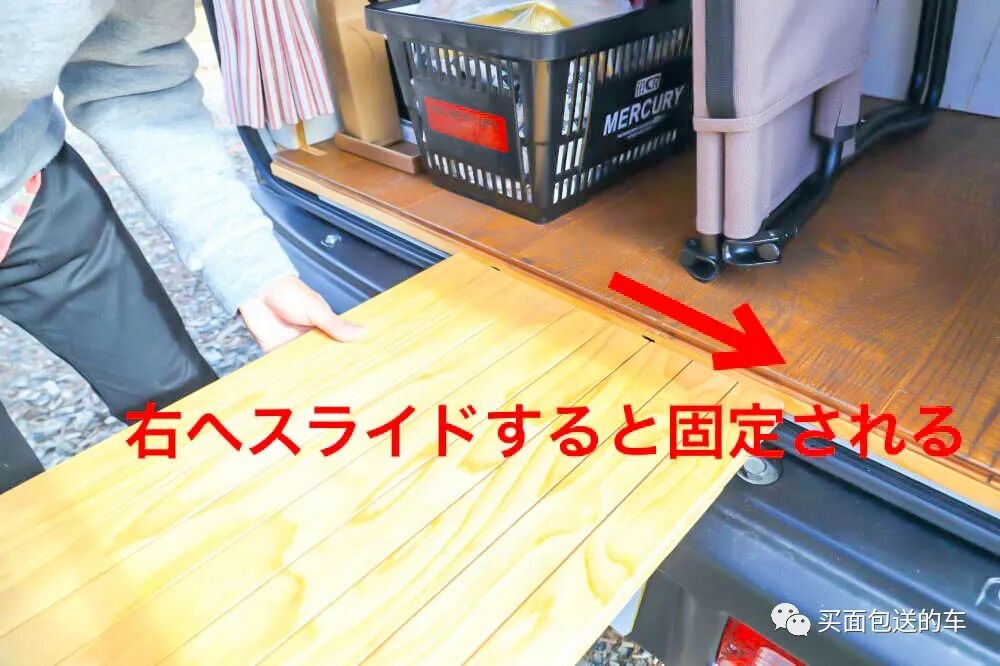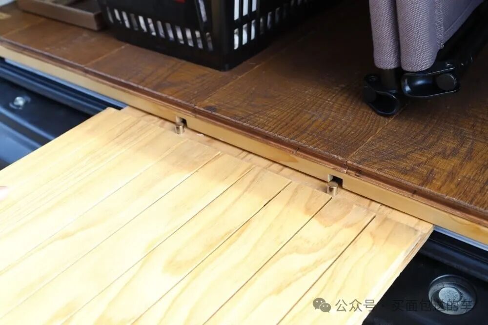 第二排座椅在折叠后以后备箱之间为纯平结构,朝子先生用折叠合页制作了可以覆盖原车地板的木板。