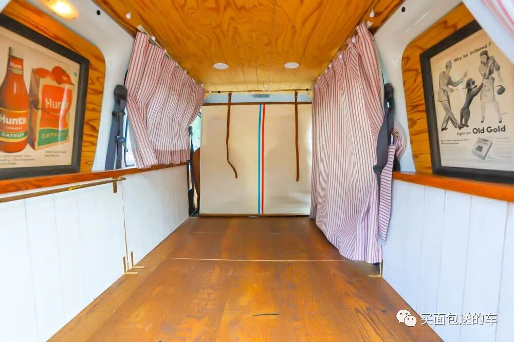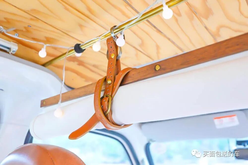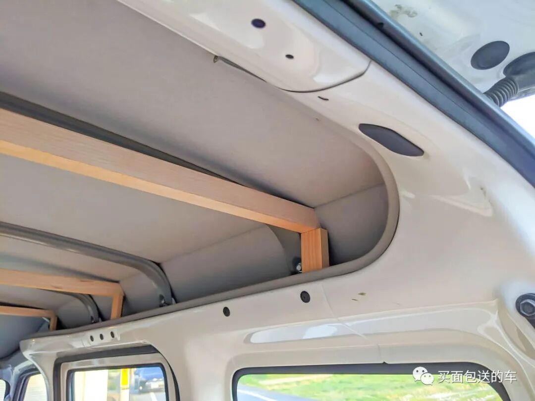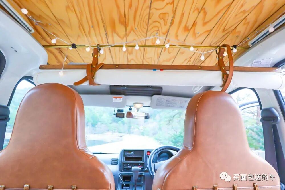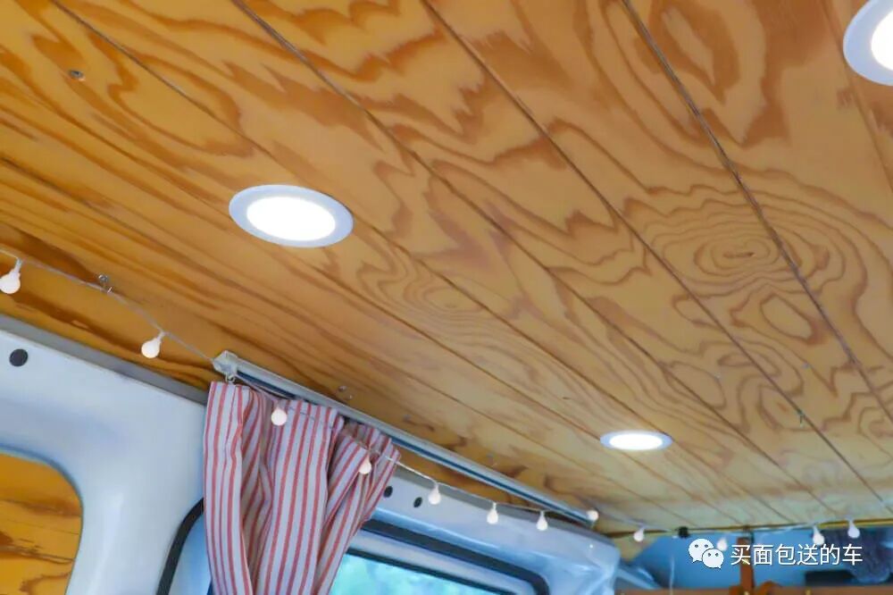 天花板的木条其实是装饰性的胶合板,便宜且轻质,嵌入了4个LED灯作为车内照明。