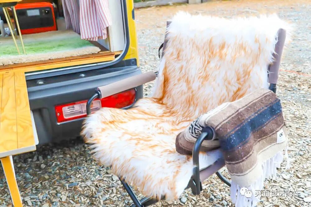 朝子先生的爱人特别喜欢的毛皮坐垫,在简易的户外折叠椅上增添出柔和的体验。