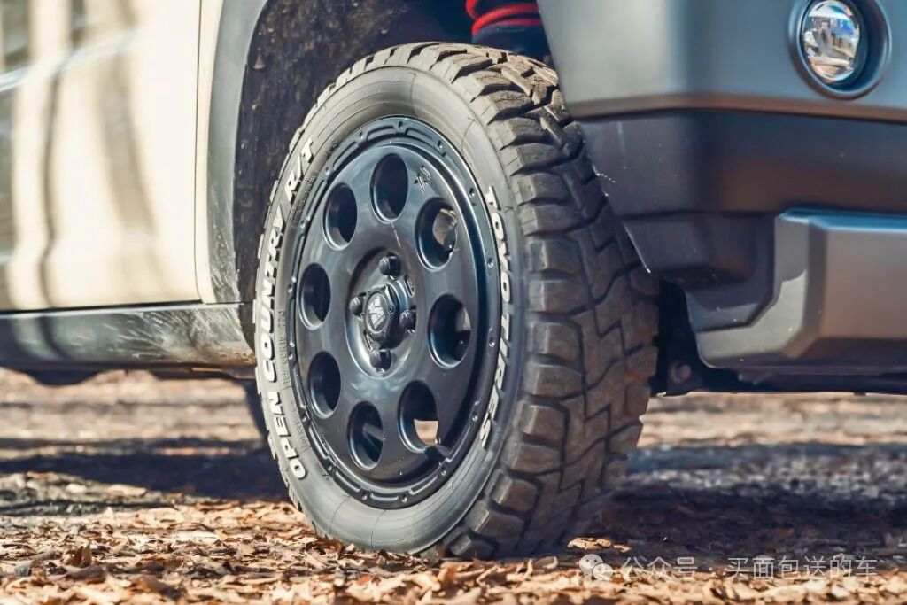 KLC出品的YAMATO复古轮毂搭配东洋轮胎的Toyo Open Country R/T (165/60R15)款式,用铝镁合金轻量化材质复刻经典的复古圆孔钢制轮毂造型,底盘通过绞牙避震做了2英寸的升高。